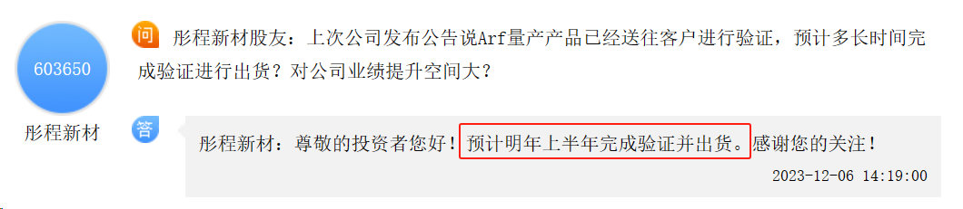 12月6日,彤程新材在投资者互动平台表示,公司Arf光刻胶预计明年上半年完成验证并出货。