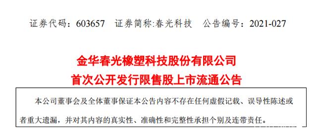 截至公告披露日,春光科技总股本1.344亿股,其中无限售流通股4007.5万股,有限售条件流通股9432.5万股;本次解禁限售股占原无限售流通股比例的235.37%,解禁市值超26亿。限售股解禁后,春光科技的首发有限售条件流通股将全部解禁上市流通。