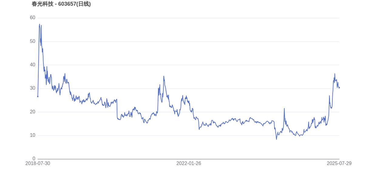 从上市首日至今,春光科技的市值实现了0.61倍的增长。2018年08月28日,春光科技的市值巅峰达到59.50亿元,股价也顺应升至61.98元。而至2025年07月29日收盘,春光科技的股价为30.33元,市值为41.00亿元,相比峰值时期市值减少18.50亿元,市值蒸发了31.09%。