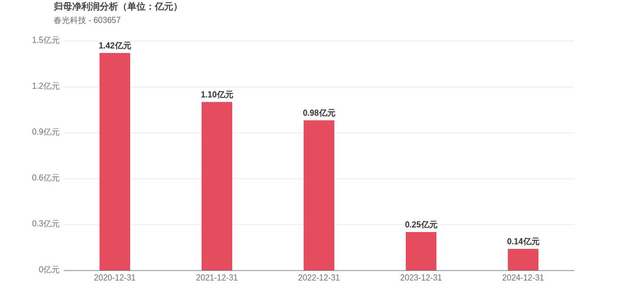 利润角度分析,2020年春光科技实现归母净利润1.42亿元,2024年0.14亿元。公司盈利能力出现明显下滑,净利润水平大幅回落。