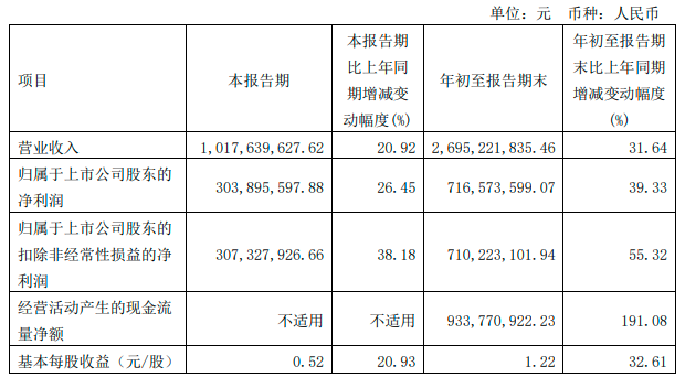 报告显示,安图生物2021年第三季度营业收入约10.18亿元,比上年同期增长20.92%,归属于上市公司股东的净利润约3.04亿元,比上年同期增长26.45%,归属于上市公司股东的扣除非经常性损益的净利润约3.07亿元,比上年同期增长38.18%,基本每股收益0.52元/股,比上年同期增长20.93%,总资产约88.31亿元,比上年同期增长8.53%。