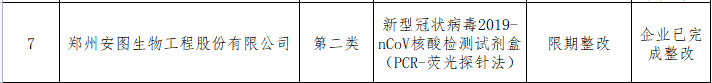 郑州安图生物工程股份有限公司的飞行检查情况显示,该企业类别为第二类,检查产品名称为新型冠状病毒2019-nCoV核酸检测试剂盒(PCR-荧光探针法),检查情况为限期整改,整改情况现为企业已完成整改。
