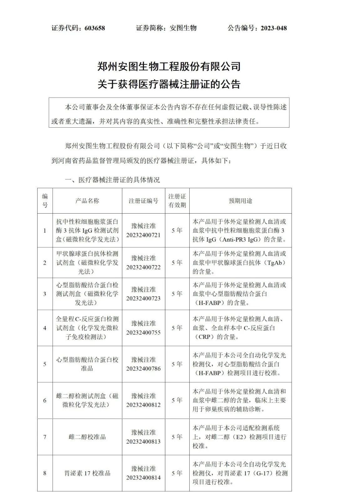 近日,安图生物8项产品:抗中性粒细胞胞浆蛋白酶3抗体IgG检测试剂盒(磁微粒化学发光法)、甲状腺球蛋白抗体检测试剂盒(磁微粒化学发光法)、心型脂肪酸结合蛋白检测试剂盒(磁微粒化学发光法)、雌二醇检测试剂盒(磁微粒化学发光法)、全量程C-反应蛋白检测试剂盒(化学发光微粒子免疫检测法)、心型脂肪酸结合蛋白校准品、雌二醇校准品、胃泌素17校准品获河南省药品监督管理局颁发的医疗器械注册证。新产品注册证的取得,进一步丰富公司产品,不断满足市场需求。