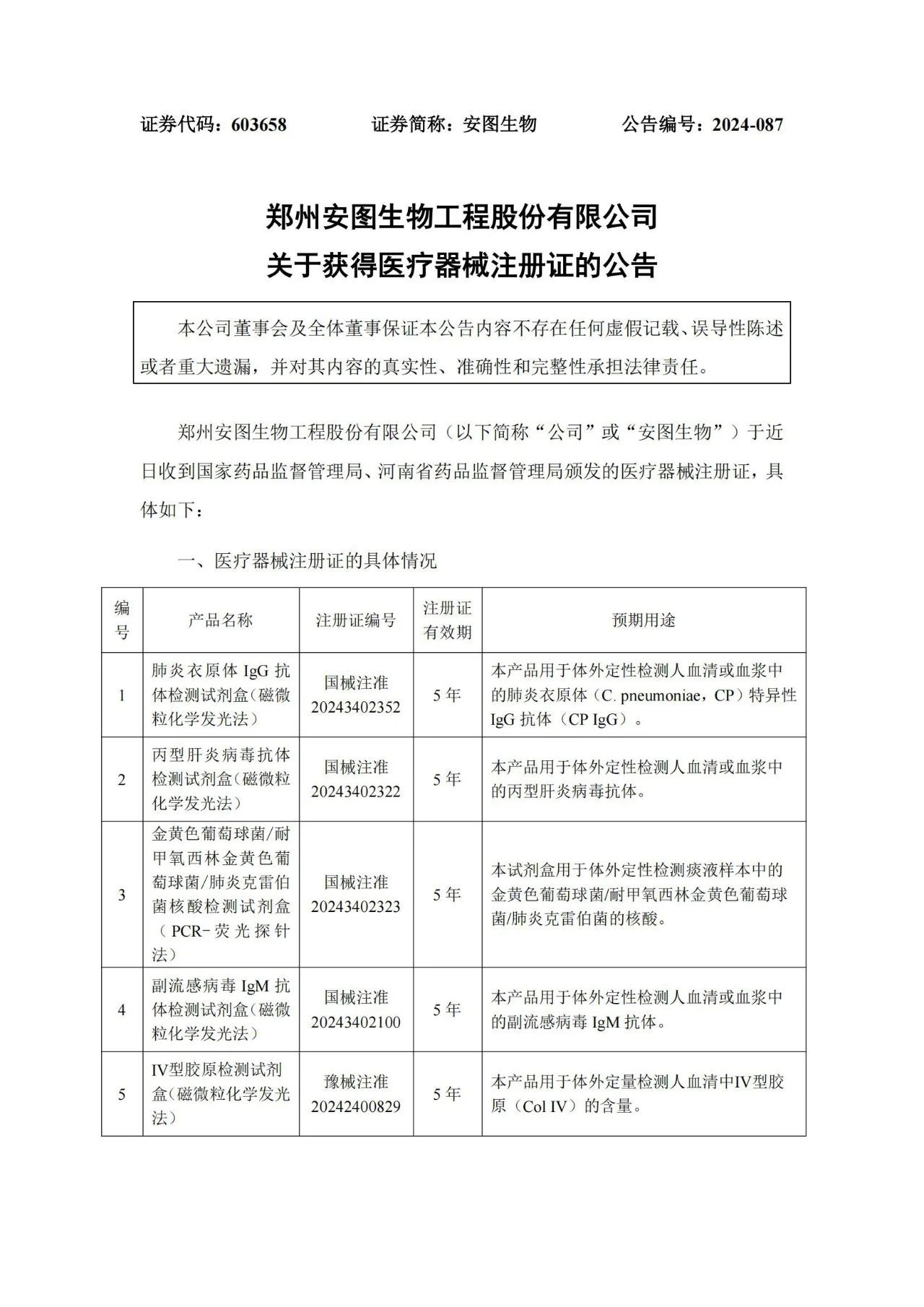 近期,安图生物获国家药品监督管理局、河南省药品监督管理局颁发的肺炎衣原体IgG抗体检测试剂盒(磁微粒化学发光法)、副流感病毒IgM抗体检测试剂盒(磁微粒化学发光法)、丙型肝炎病毒抗体检测试剂盒(磁微粒化学发光法)、Ⅳ型胶原检测试剂盒(磁微粒化学发光法)、金黄色葡萄球菌/耐甲氧西林金黄色葡萄球菌/肺炎克雷伯菌核酸检测试剂盒(PCR-荧光探针法)共5项医疗器械注册证。新产品注册证的取得,进一步丰富公司产品线,不断满足市场需求。