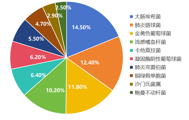 2023年中国儿童细菌耐药监测菌株(n=58335例)前十位分离株占比