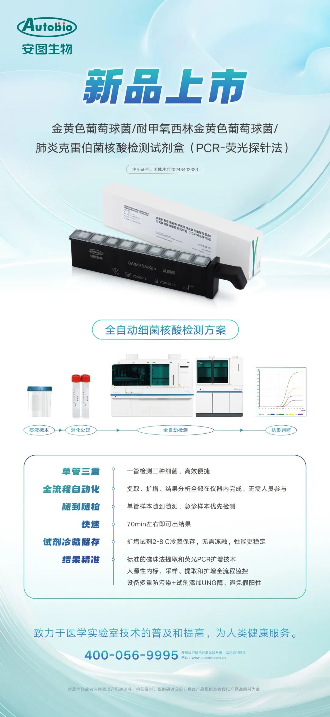 呼吸道感染病原菌种类复杂,感染形式多样,耐药菌和混合感染的挑战使得快速精准的病原学诊断显得尤为重要。传统的细菌核酸检测流程复杂,且需要前期攒样,无法满足随时、随机检测的需求。因此,安图生物推出了基于荧光PCR检测技术的金黄色葡萄球菌/耐甲氧西林金黄色葡萄球菌/肺炎克雷伯菌核酸检测试剂盒。该产品具有高灵敏度和高特异度,可提升细菌阳性检出率,指导临床精准诊疗。此外,该款试剂可搭载安图全自动化核酸检测设备,做到随来随测,快速精准,最大程度提升了实验室核酸检测的效率。