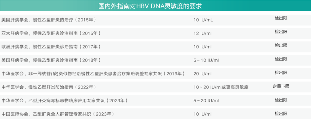 2022年版《慢性乙型肝炎防治指南》推荐意见9明确指出:对 HBsAg 阳性者,包括正在接受抗病毒治疗的CHB患者,应尽可能采用高灵敏且检测线性范围大的HBV DNA检测方法。同时,国内外多部指南均明确要求提升HBV DNA检测的灵敏度。