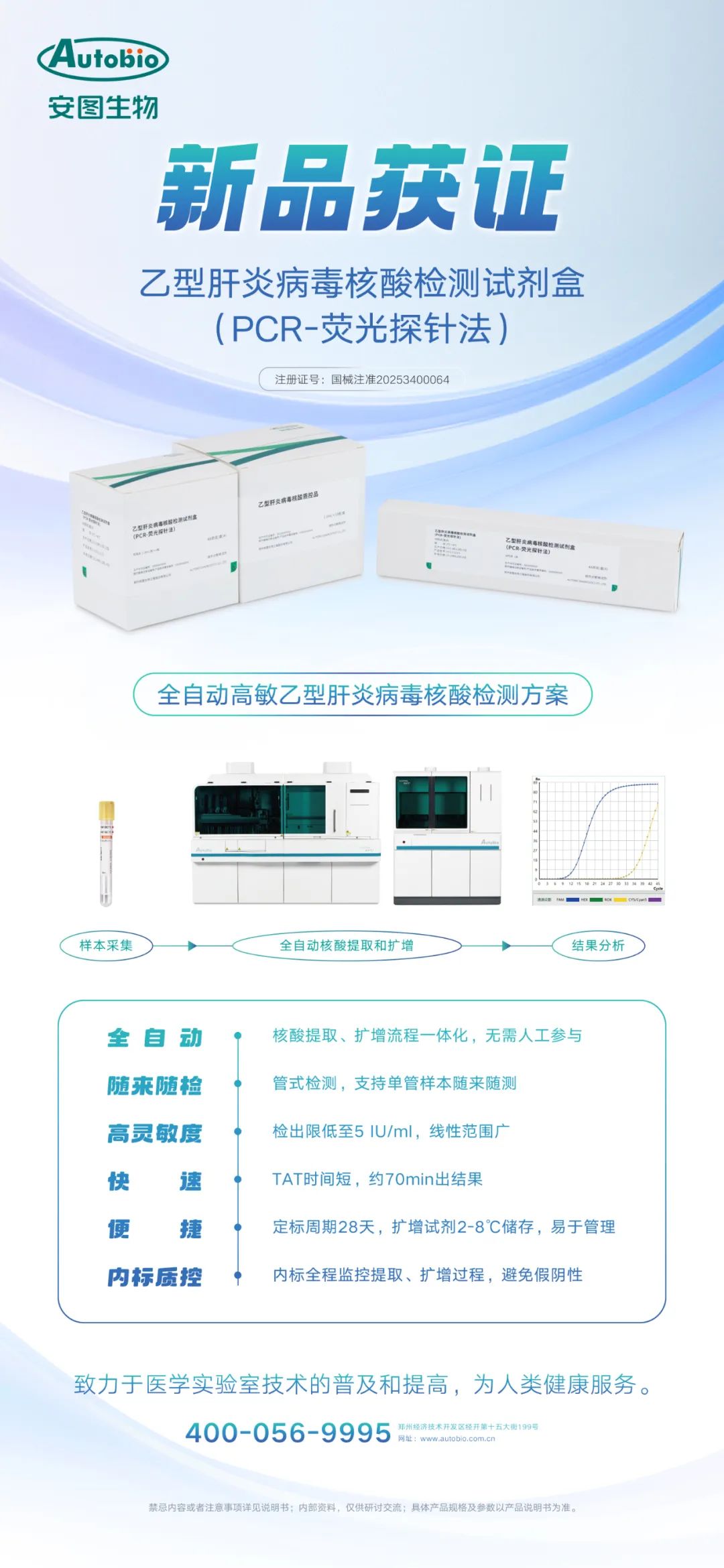 近日,安图生物乙型肝炎病毒核酸检测试剂盒(PCR-荧光探针法)获国家药品监督管理局颁发的医疗器械注册证(国械注准20253400064)。