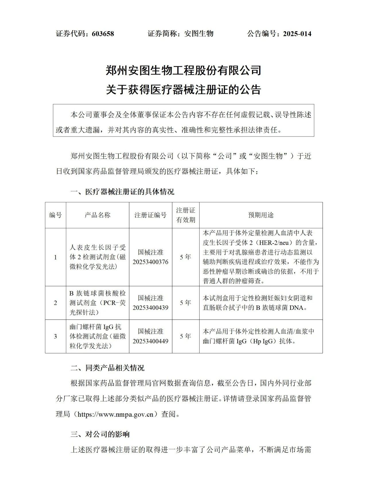 近期,安图生物人表皮生长因子受体2检测试剂盒(磁微粒化学发光法)、幽门螺杆菌IgG抗体检测试剂盒(磁微粒化学发光法)、B族链球菌核酸检测试剂盒(PCR-荧光探针法)3项产品获国家药品监督管理局颁发的医疗器械注册证。新产品注册证的取得,进一步丰富公司产品线,不断满足市场需求。