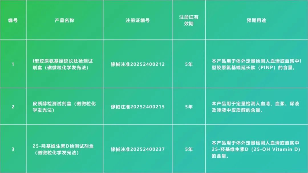近日,安图生物I型胶原氨基端延长肽检测试剂盒(磁微粒化学发光法)、皮质醇检测试剂盒(磁微粒化学发光法)、25-羟基维生素D检测试剂盒(磁微粒化学发光法)3项产品获河南省药品监督管理局颁发的医疗器械注册证。