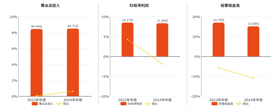 公司营业总收入为44.71亿元。归母净利润为11.94亿元,较去年同报告期归母净利润减少2298.70万元,同比较去年同期下降1.89%。经营活动现金净流入为13.09亿元,较去年同报告期经营活动现金净流入减少1.61亿元,同比较去年同期下降10.92%。