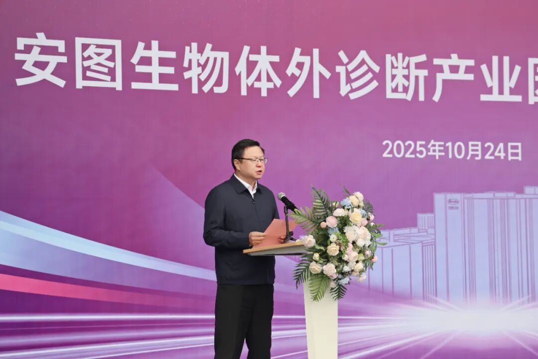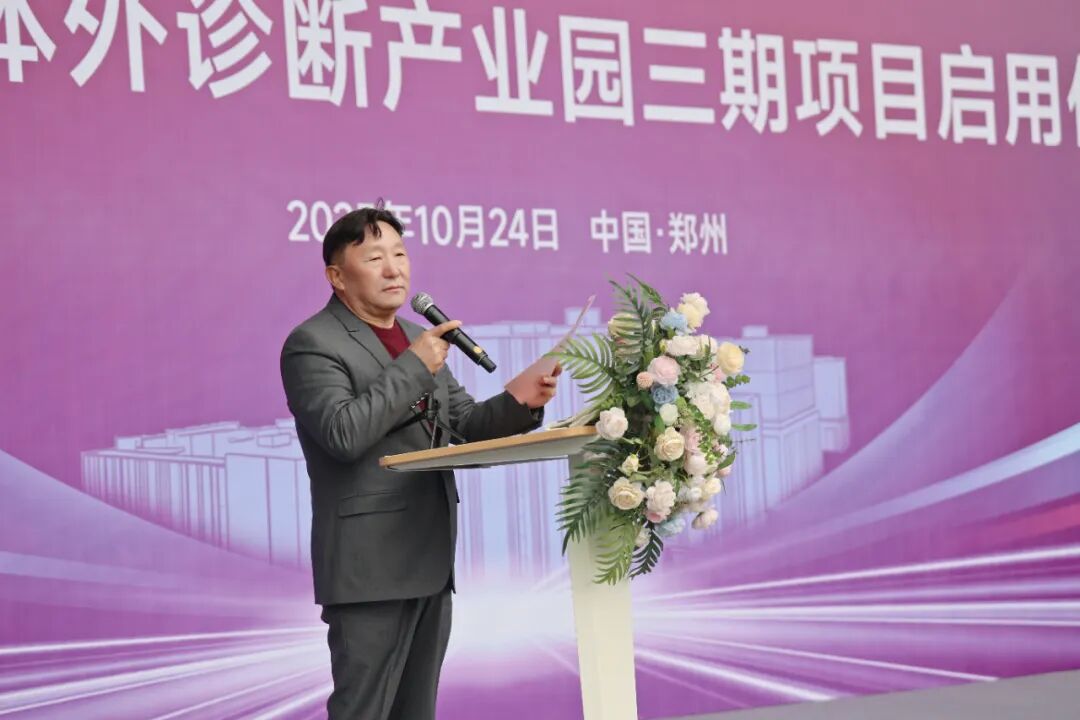 郑州经开区党工委副书记、管委会主任张波致辞。他代表经开区管委会向安图生物致以热烈祝贺,并充分肯定了安图生物多年来在体外诊断领域所取得的成就。他提到,安图生物体外诊断产业园从2015年一期启用,2023年二期投产到如今三期启用,标志着国内规模最大的体外诊断产业基地正式落成,成为经开区高端制造的一张靓丽的名片。他指出,安图生物三期项目的启用不仅是企业自身发展的新起点,更是推动区域生物医药产业高质量发展的重要引擎。希望安图生物以此为契机,持续加大科技创新力度,深化产业链协同合作,在体外诊断领域不断实现新突破,为健康中国建设贡献更大力量。