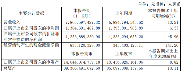 璞泰来昨日晚间披露2023年半年度报告,公司2023年上半年营业收入为78.06亿元,同比增长13.21%;归属于上市公司股东的净利润为13.04亿元,同比下降6.55%;归属于上市公司股东的扣除非经常性损益的净利润为12.54亿元,同比下降5.96%;经营活动产生的现金流量净额为8.33亿元,同比增加141.20%。