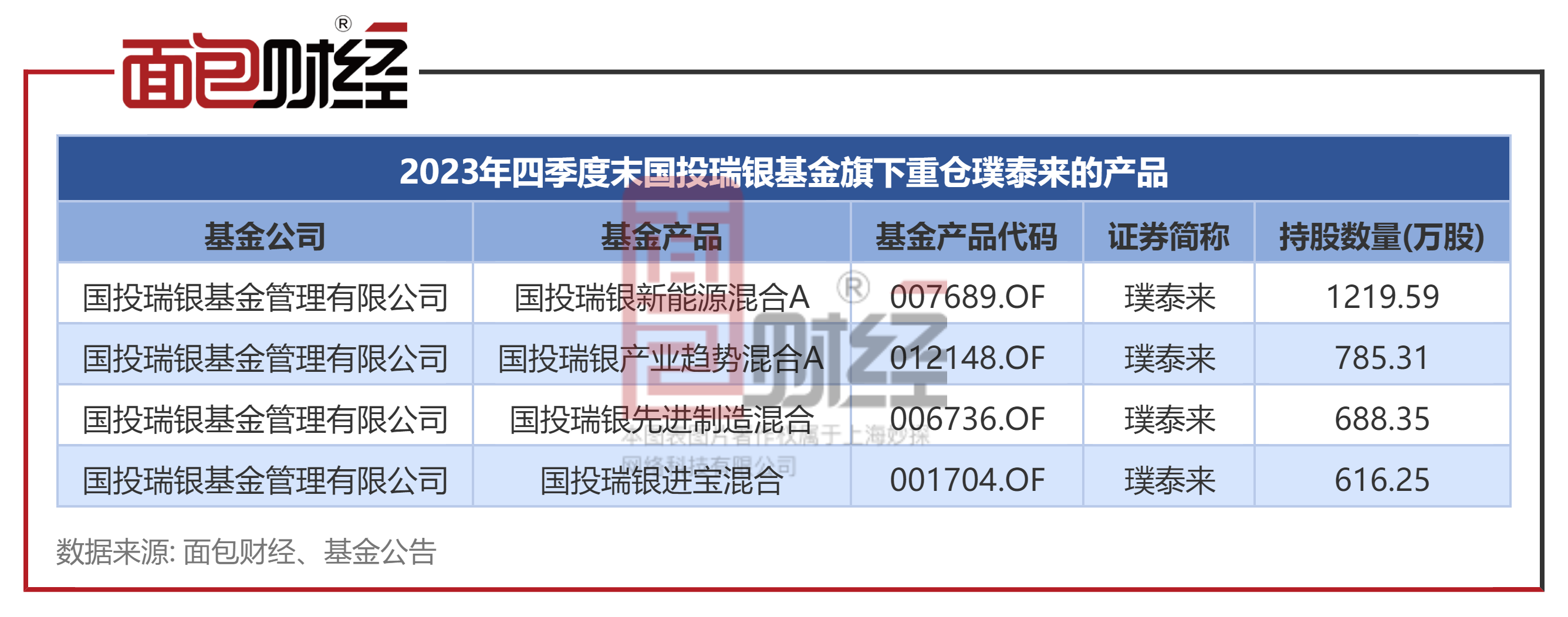 面包财经研究员梳理公开资料发现,国投瑞银基金旗下四只产品于2023年四季度末重仓持有璞泰来,涉及的产品包括国投瑞银新能源混合、国投瑞银产业趋势混合等,基金经理均为施成。