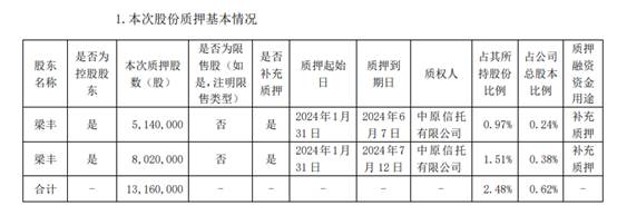 本次股份质押数量为2413.6万股,占其所持股份比例4.54%,占公司总股本比例为1.13%。质押起始日为2024年2月5日,质权人为招商证券股份有限公司、华泰证券股份有限公司。公司称,本次质押股份未被用作重大资产重组业绩补偿等事项的担保或其他保障用途。