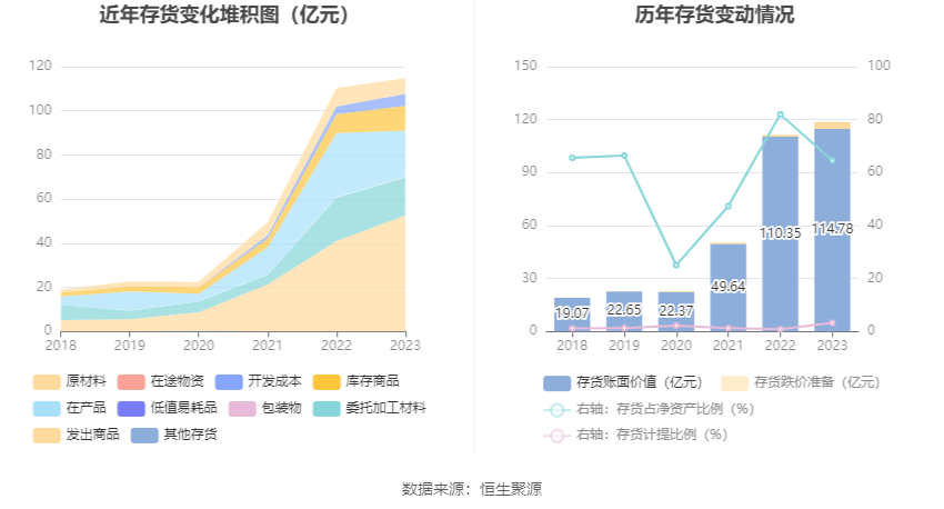从存货变动来看,截至2023年年末,公司存货账面价值为114.78亿元,占净资产的64.58%,较上年末增加4.43亿元。其中,存货跌价准备为3.84亿元,计提比例为3.24%。