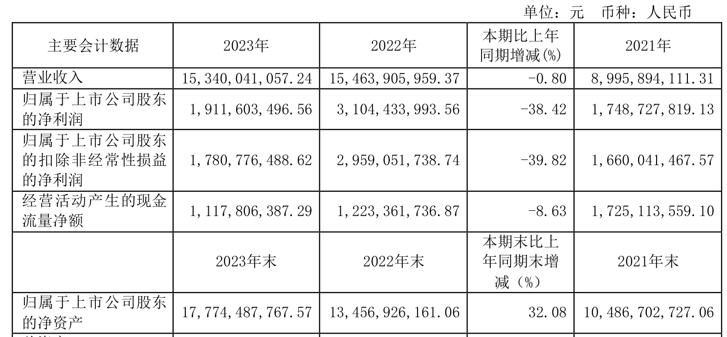 数据显示,2023年公司加权平均净资产收益率为13.27%,较上年同期下降12.73个百分点;公司2023年投入资本回报率为8.96%,较上年同期下降10.72个百分点。