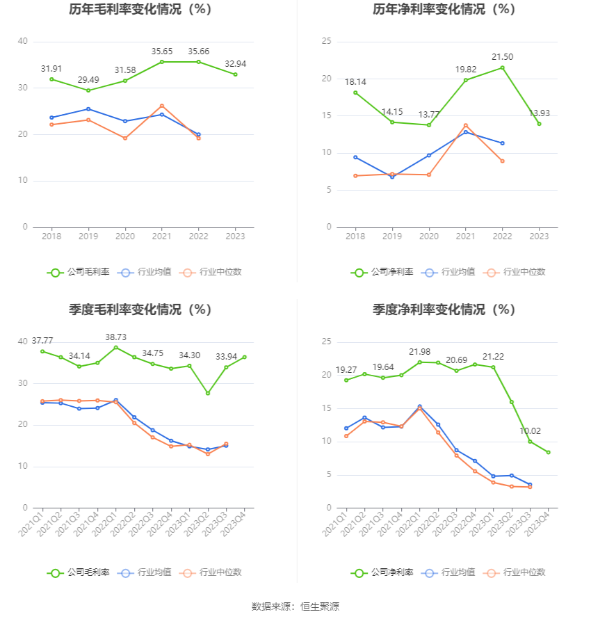 2023年,公司毛利率为32.94%,同比下降2.72个百分点;净利率为13.93%,较上年同期下降7.57个百分点。从单季度指标来看,2023年第四季度公司毛利率为36.41%,同比上升2.79个百分点,环比上升2.47个百分点;净利率为8.40%,较上年同期下降13.24个百分点,较上一季度下降1.62个百分点。
