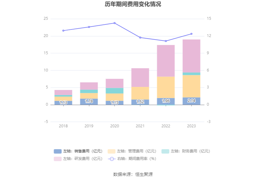 2023年,公司期间费用为18.98亿元,较上年同期增加1.79亿元;期间费用率为12.38%,较上年同期上升1.26个百分点。其中,销售费用同比增长8.99%,管理费用同比增长4.37%,研发费用同比增长4.25%,财务费用由去年同期的-1901.66万元变为7576.48万元。
