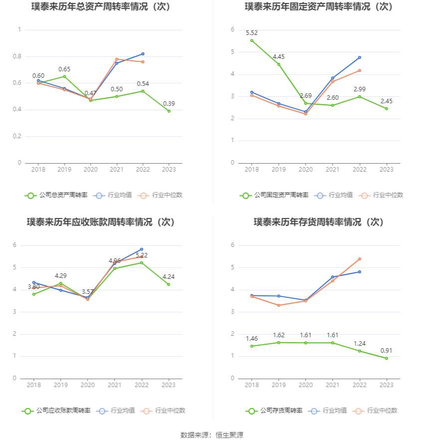 营运能力方面,2023年,公司公司总资产周转率为0.39次,上年同期为0.54次(2022年行业平均值为0.82次,公司位居同行业33/44);固定资产周转率为2.45次,上年同期为2.99次(2022年行业平均值为4.76次,公司位居同行业32/44);公司应收账款周转率、存货周转率分别为4.24次、0.91次。