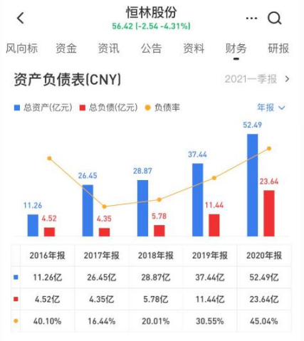 数据显示,2017年-2020年,恒林股份负债分别是4.35亿元、5.78亿元、11.44亿元和23.64亿元,负债率分别为16.44%、20.01%、30.55%和45.04%。近4年,恒林股份的负债和负债率一直在持续上升,其中2020年的负债增长一倍以上,负债率增长近15%。