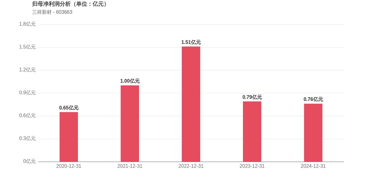 利润角度分析,2020年三祥新材实现归母净利润0.65亿元,2024年0.76亿元。期间利润波动较大,2021年和2022年实现较快增长,2023年和2024年有所回落。