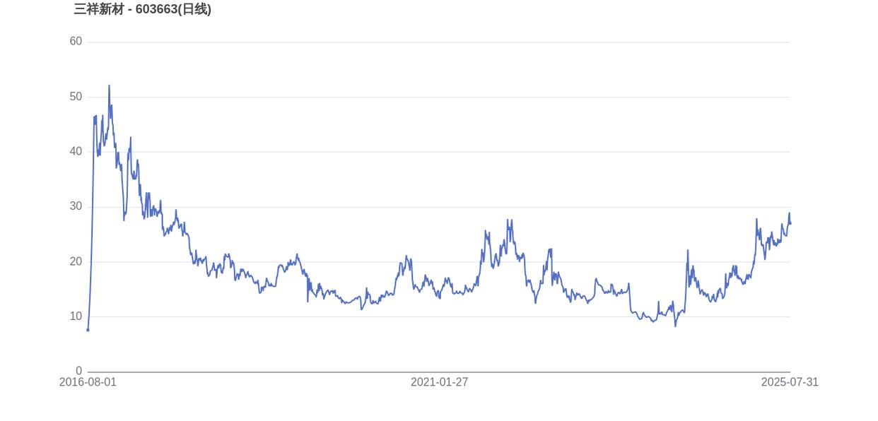 从上市首日至今,三祥新材的市值实现了10.23倍的增长,显示出较强的成长性。2025年3月3日,三祥新材的市值巅峰达到130.13亿元,股价也顺应升至30.73元。而至7月31日收盘,三祥新材的股价为27.04元,市值为114.46亿元,相比峰值时期市值减少15.67亿元,市值蒸发了12.04%。