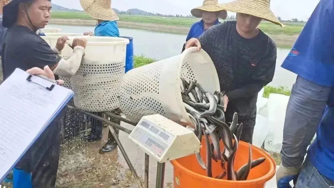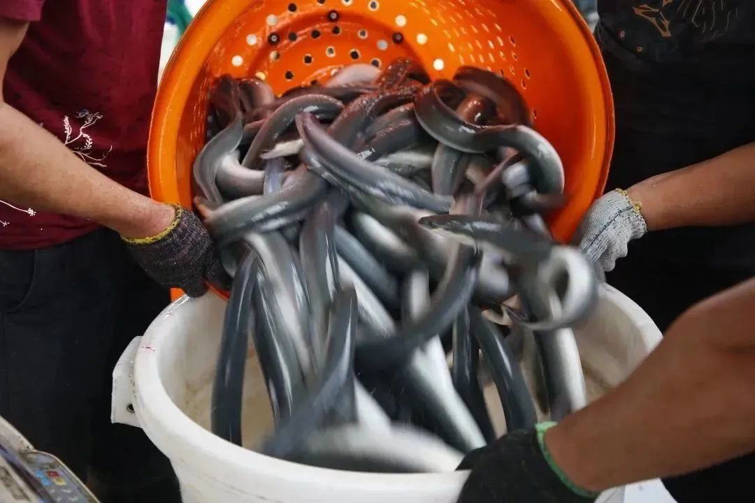为了确保当日能顺利出鱼,基地养殖团队早在前几日便实施了严谨周密的检验步骤,并逐步安排出鱼准备工作。出鱼正式开始,基地员工有序捞起鳗鱼,分拣、称重、统计,倒入运鱼车内,待装车完毕后,便马不停蹄地发往烤鳗厂。