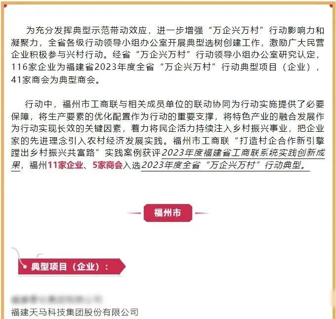 天马科技讯近日,天马科技集团荣获福建省“万企兴万村”行动领导小组颁发的2023年度全省典型项目(企业)荣誉!此次入选不仅是对天马科技集团多年来在履行社会责任和可持续发展方面不懈努力的肯定,也是对其在促进乡村振兴中所取得突出成就的高度认可。