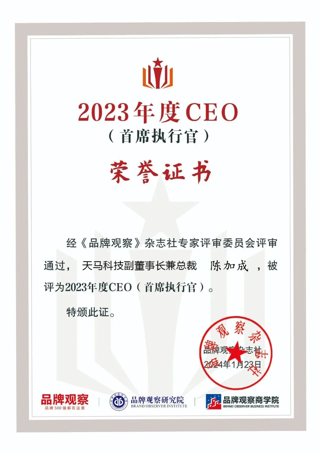 天马科技讯近日,《品牌观察》杂志正式揭晓2023年度CEO榜单,天马科技集团副董事长、执行总裁陈加成先生凭借其卓越的战略领导力、深厚的管理智慧以及对品牌建设的卓越贡献,荣获“2023年度首席执行官”殊荣。