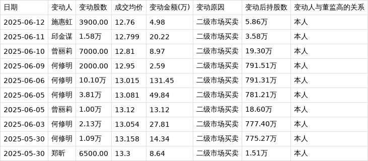 上交所公开信息显示,6月12日,天马科技高级管理人员施惠虹在二级市场买卖公司股票,增持股数0.39万股,成交均价12.76元,变动金额4.98万元,变动后持股数为5.86万股。