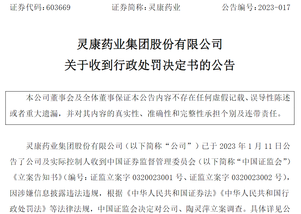2023年1月11日,灵康药业及实控人收到中国证监会《立案告知书》。(详见此前报道《涉非经营性资金占用,灵康药业及实控人被立案调查,此前曾被通报批评》)