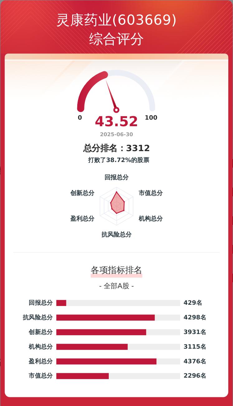 金融界上市公司研究院构建了一套上市公司韧性评价体系,从企业盈利、科技创新、股东回报、经营抗风险、市值表现及机构吸引力六个维度对企业进行量化评分,满分为100分。灵康药业的韧性评价总分为43.52分,在A股5405家可比上市公司中排名第3312位。