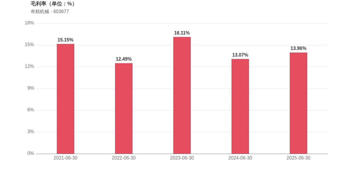 从反映盈利质量的指标来看,奇精机械的净利率由2024年上半年的4.28%下滑至3.83%,下降了0.45个百分点,而毛利率从2024年上半年的13.07%提升至13.96%,上升了0.89个百分点。净资产收益率方面,2025年上半年为3.49,同比下降了0.04个百分点。
