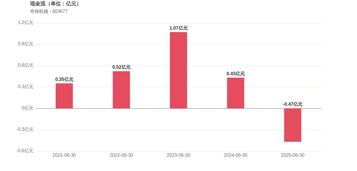 在经营稳健性方面,奇精机械面临现金流转负的压力,存货周转天数为84.96天,较2024年上半年增长了0.94%。经营活动产生的现金流净额为-0.47亿元,相比2024年同期的0.43亿元,由正转负,显示出公司经营活动现金回笼能力有所减弱。此外,2025年上半年的资产负债率为51.03%,同比增长了1.33个百分点,这意味着公司财务杠杆有所提升。