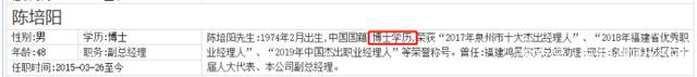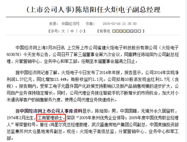 东方财富网高管资料显示,陈培阳出生于1974年,博士学历,是菲律宾国父大学工商管理博士。但在2015年火炬电子发布的公告里显示,陈培阳是工商管理硕士。因此,其在职博士学位应该是最近几年取得的,不知道他是否一边工作一边去国外念博士?