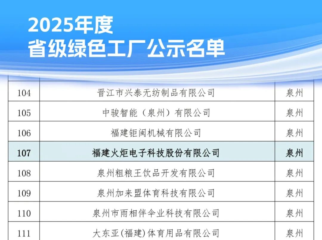 日前,福建省工业和信息化厅发布2025年度省级绿色制造公示名单,火炬电子成功入选省级绿色工厂称号名单。