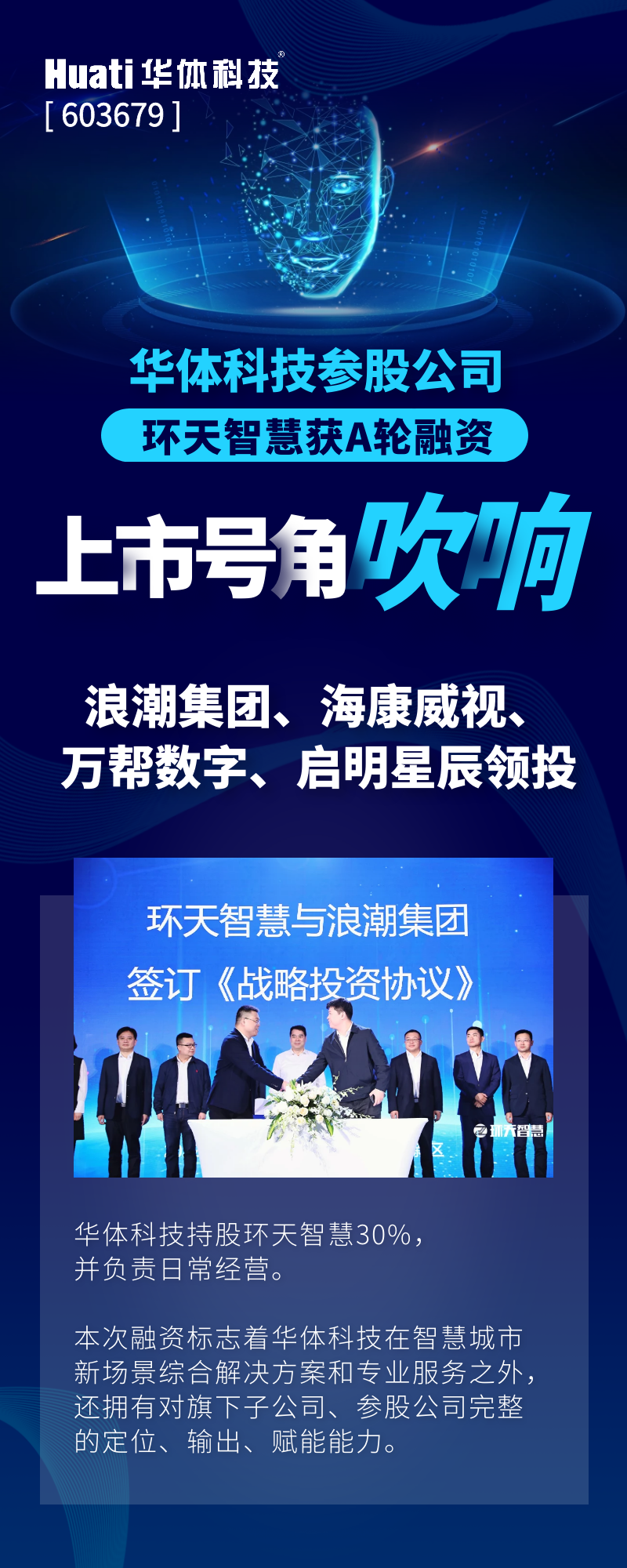 3月15日,华体科技(603679)参股公司眉山环天智慧科技有限公司(以下简称:环天智慧)与浪潮集团、海康威视、万帮数字、启明星辰签署了A轮投资协议,与长光卫星签订了卫星项目合作协议,环天智慧上市号角正式吹响。