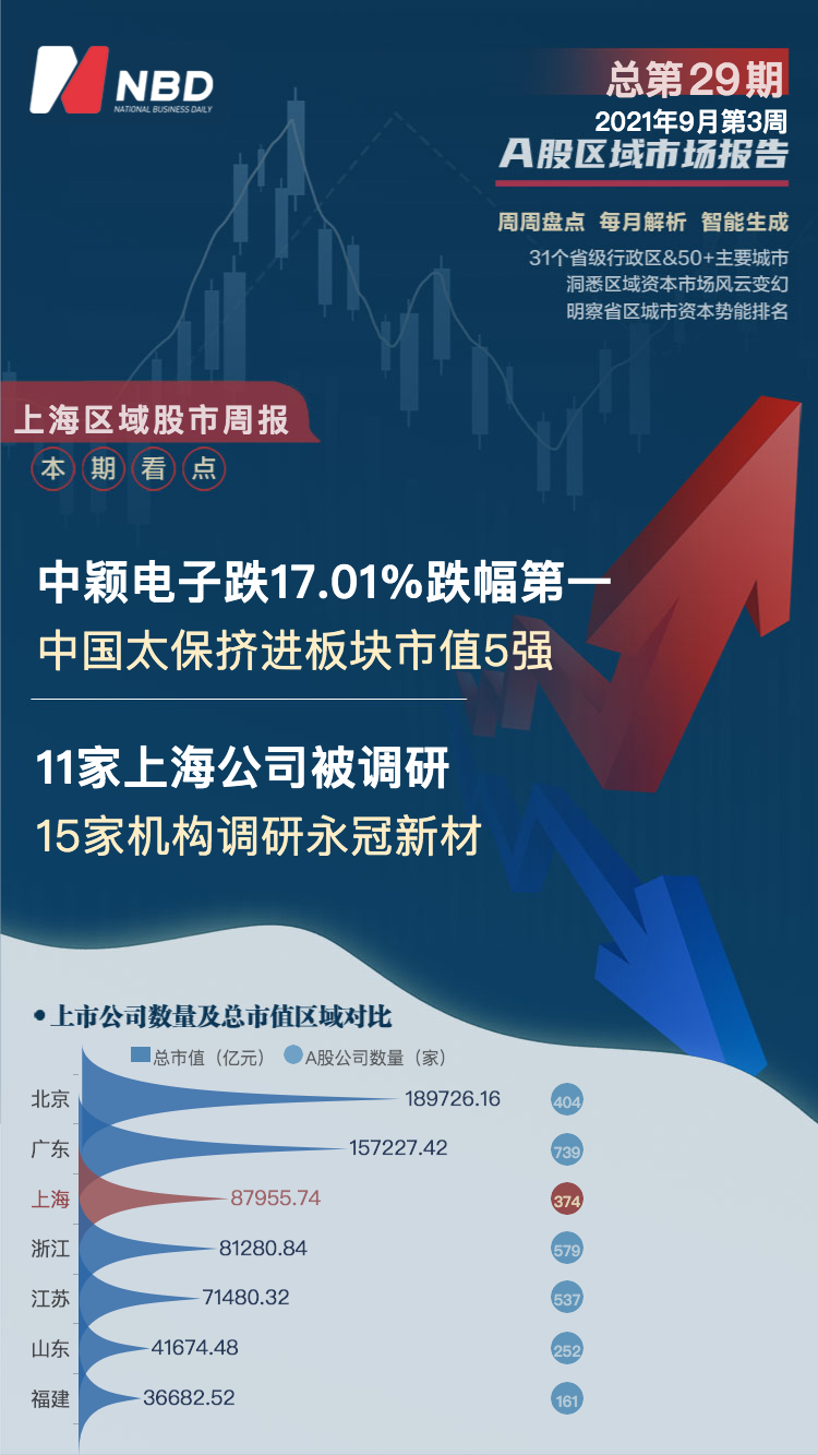 涨跌幅方面,截至2021年9月19日,上海板块市值与前一周相比,区间涨幅为-2.59%(加权平均值),涨幅排名全国第18位。
