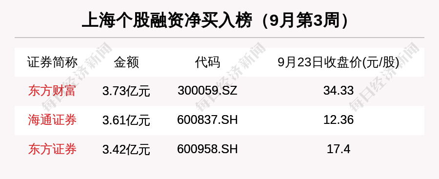 先看融资资金,9月第3周,上海板块融资净买入总额为30.82亿元。融资净买入最多的上海股是东方财富,金额是3.73亿元。其次是海通证券(3.61亿元)和东方证券(3.42亿元)。