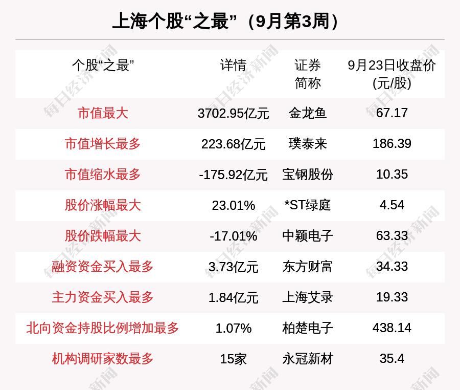 9月第3周(2021年9月13日~2021年9月19日),上海股中,璞泰来市值增长最多;宝钢股份市值缩水最多;涨幅最大的是*ST绿庭,上涨幅度为23.01%;跌幅最大的是中颖电子。此外,永冠新材被15家机构调研,且同时被北向资金,融资资金看好。