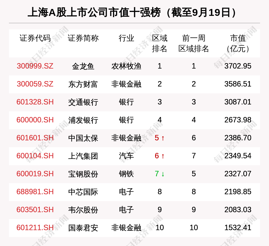 截至9月19日,上海板块市值最大的是金龙鱼,市值最小的是ST龙韵。上周市值增长最多的是璞泰来,增长223.68亿元;市值缩水最多的是宝钢股份,缩水175.92亿元。