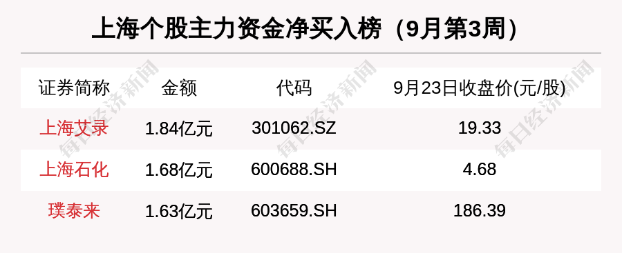 主力资金方面,9月第3周,上海艾录净买入额居首位,为1.84亿元,其次是上海石化(1.68亿元)和璞泰来(1.63亿元)。