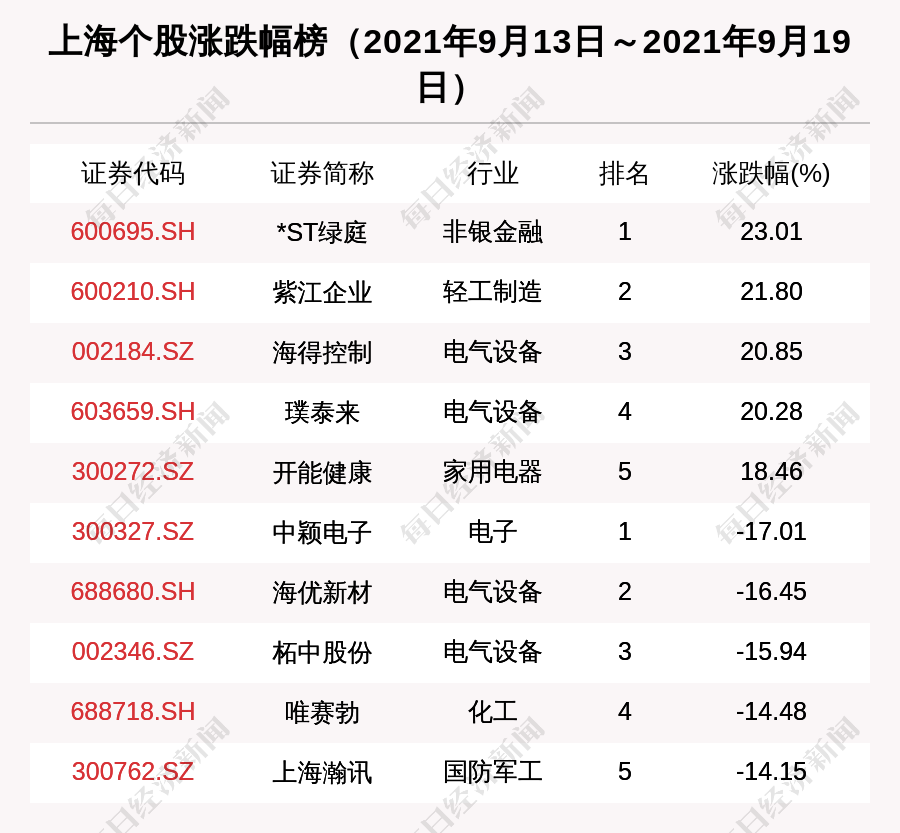从涨跌幅来看,上周涨幅最大的上海公司是*ST绿庭,上涨幅度为23.01%。跌幅最大的是中颖电子,下跌幅度为17.01%。