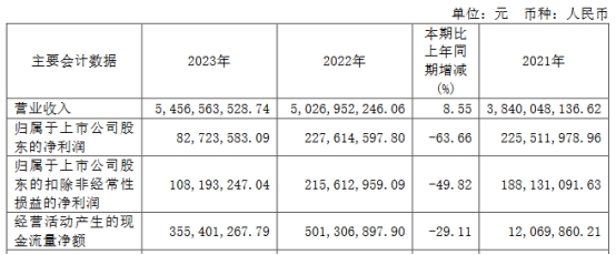 2023年,公司营业收入54.57亿元,同比增长8.55%;归母净利润8272.36万元,同比下降63.66%;扣非净利润1.08亿元,同比下降49.82%;经营活动产生的现金流量净额为3.55亿元,同比下降29.11%。