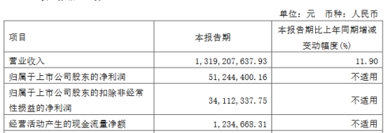 2024年第一季度,公司营业收入13.19亿元,同比增长11.90%;归母净利润5124.44万元;扣非净利润3411.23万元;经营活动产生的现金流量净额为123.47万元。