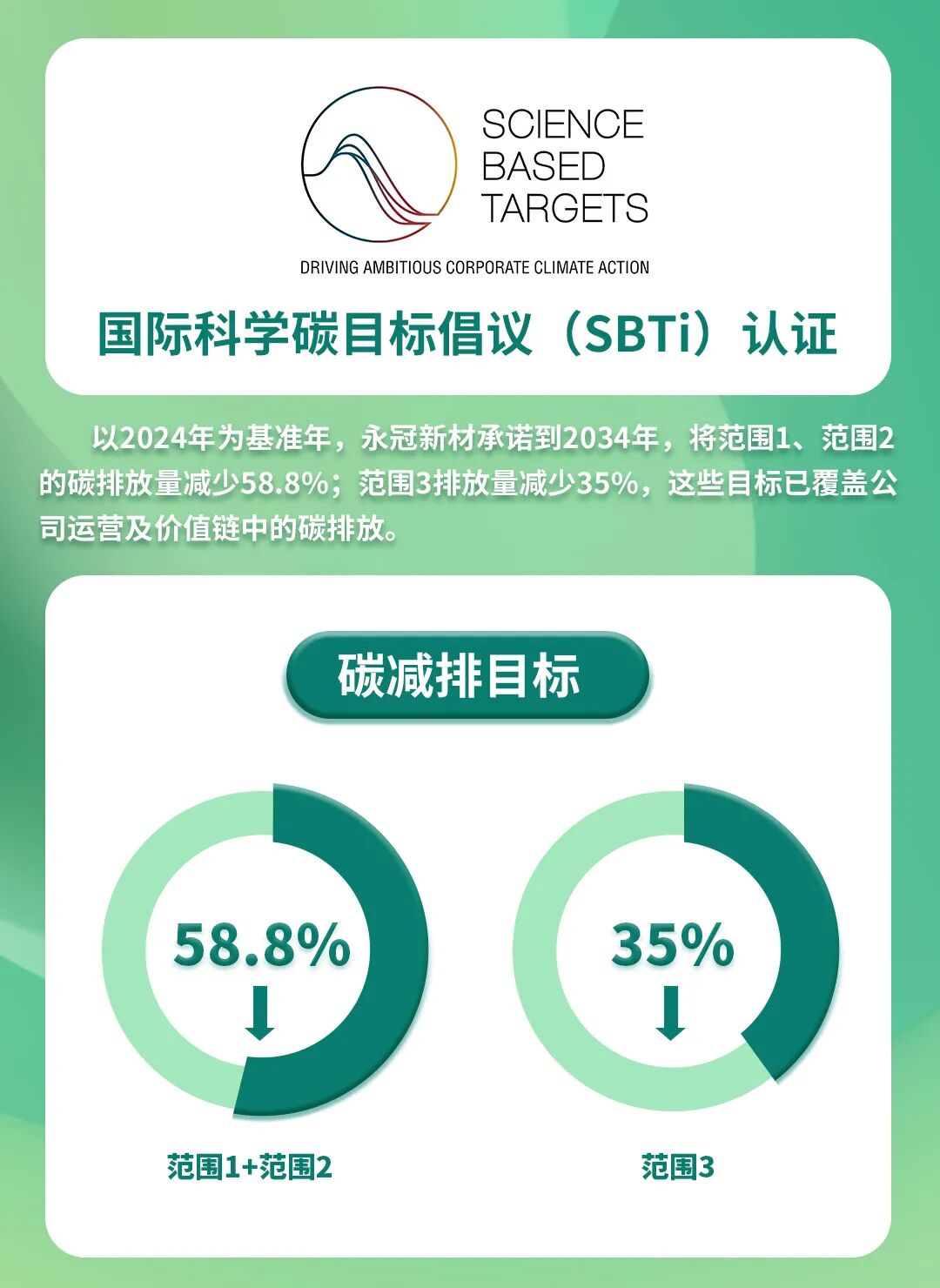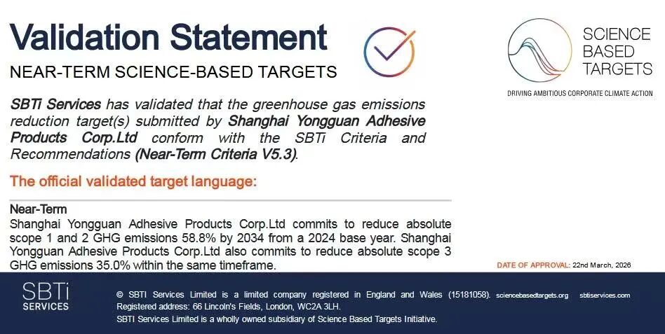 近日,上海永冠众诚新材料科技(集团)股份有限公司(以下简称“永冠新材”)提交的近期温室气体(GHG)减排目标已成功通过科学碳目标倡议(SBTi)审核验证,这标志着公司低碳转型战略与国际科学减碳标准全面接轨,主动承担应对全球气候变化的责任担当与行动自觉,更彰显了作为具有全球视野的胶粘解决方案提供商在可持续发展道路上的坚定承诺与务实行动。