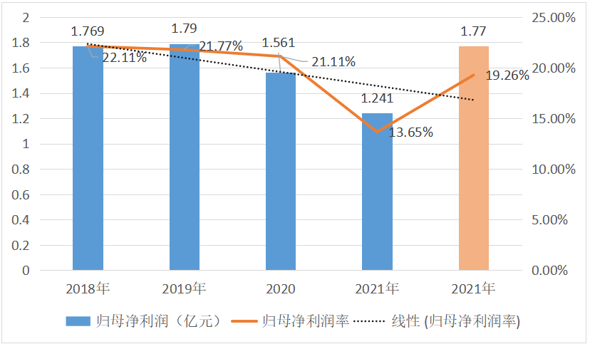 但剔除新租赁准则影响,锦和商业实现营业收入9.19亿元,同比上升24.3%;归母净利润1.77亿元,同比上升13.7%。尽管归母净利率在剔除新租赁准则后迅速回升至19.26%,但同比2020年下降1.85个百分点,且自2018年以来连续四年均是下降态势,2021年更是跌破20%。