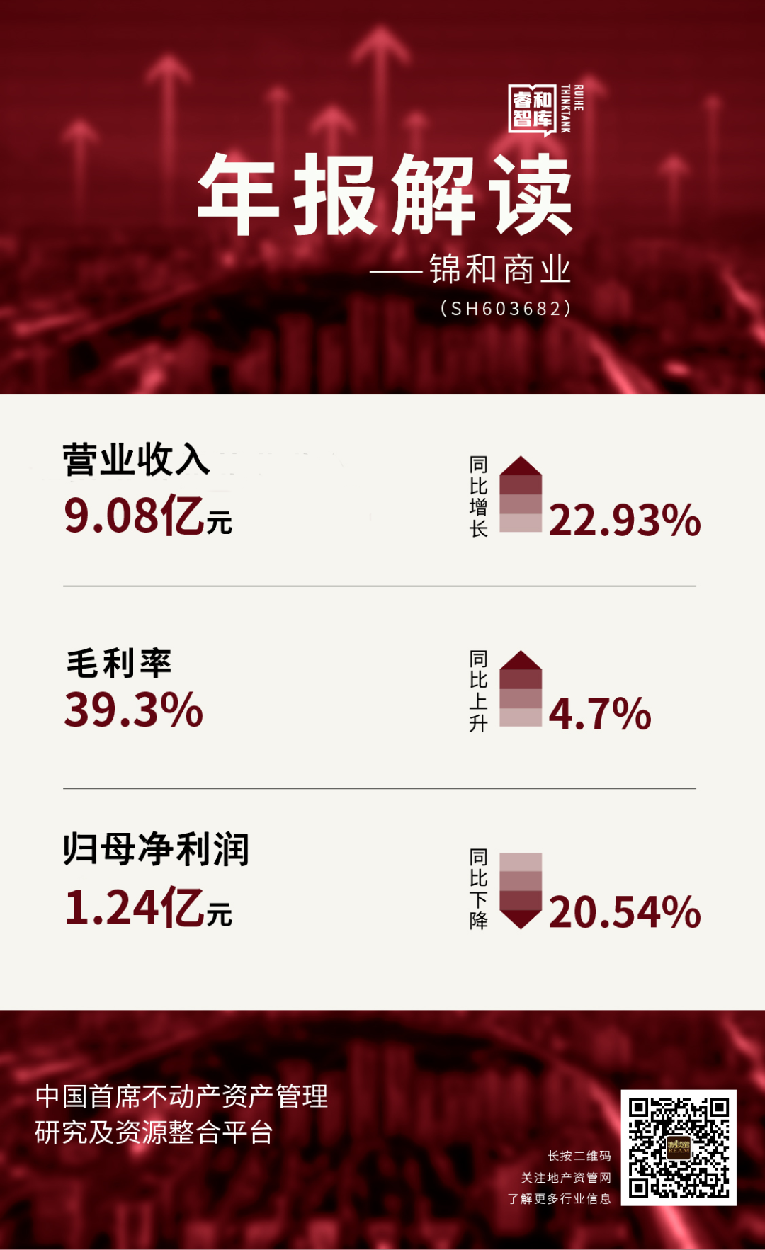 近日,锦和商业发布了2021年度业绩报告,报告显示公司整体业绩稳步上升。营业收入9.088亿元,同比增长22.93%;毛利率39.3%,同比上升4.7个百分点;受新租赁规则影响,归母净利润为1.24亿元,同比下降20.54%,剔除该影响后,归母净利润为1.77亿元,同比上升13.7%。