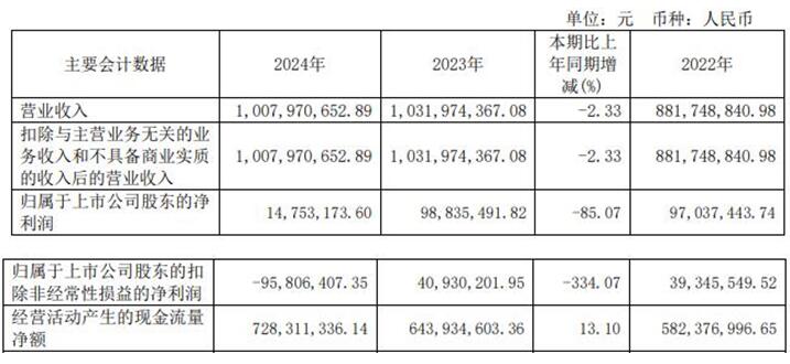 锦和商管(603682.SH)近日发布的2024年年度报告显示,公司2024年营业收入为10.08亿元,同比下降2.33%;归属于上市公司股东的净利润为1475.32万元,同比下降85.07%;归属于上市公司股东的扣除非经常性损益的净利润为-9580.64万元,上年同期为4093.02万元;经营活动产生的现金流量净额7.28亿元,同比增长13.10%。